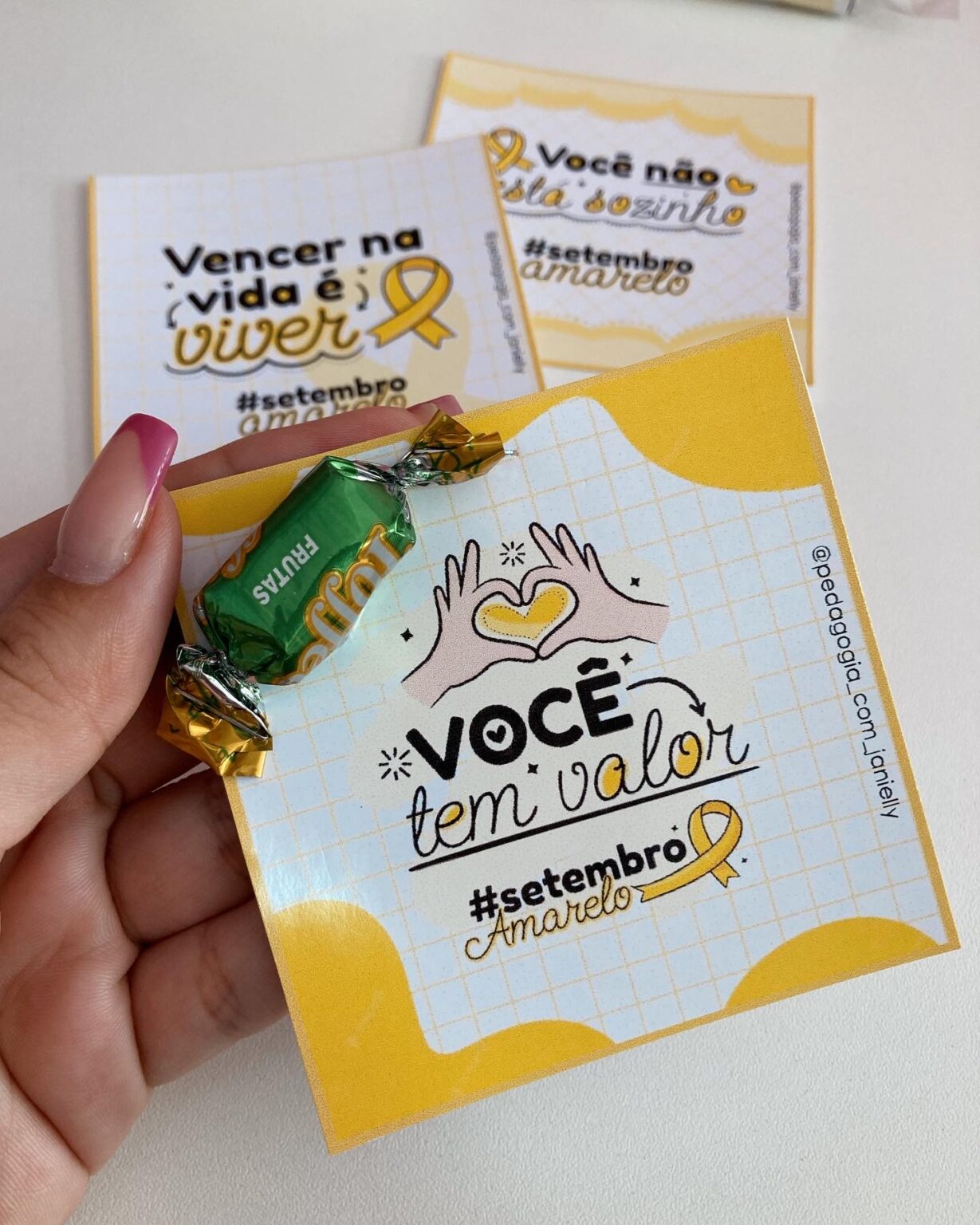 - Pirulitos amarelos com mensagens de apoio: Encomende pirulitos amarelos e personalize-os com mensagens de apoio ou o logo do Setembro Amarelo.