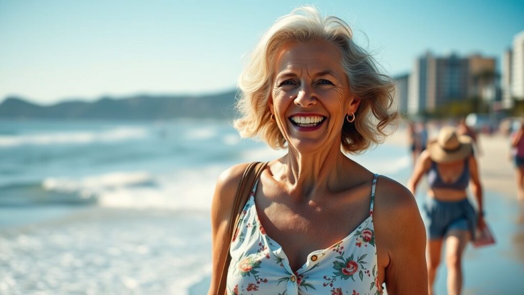 Mulher brasileira 60+ sorrindo na praia do Rio, envelhecimento saudável
