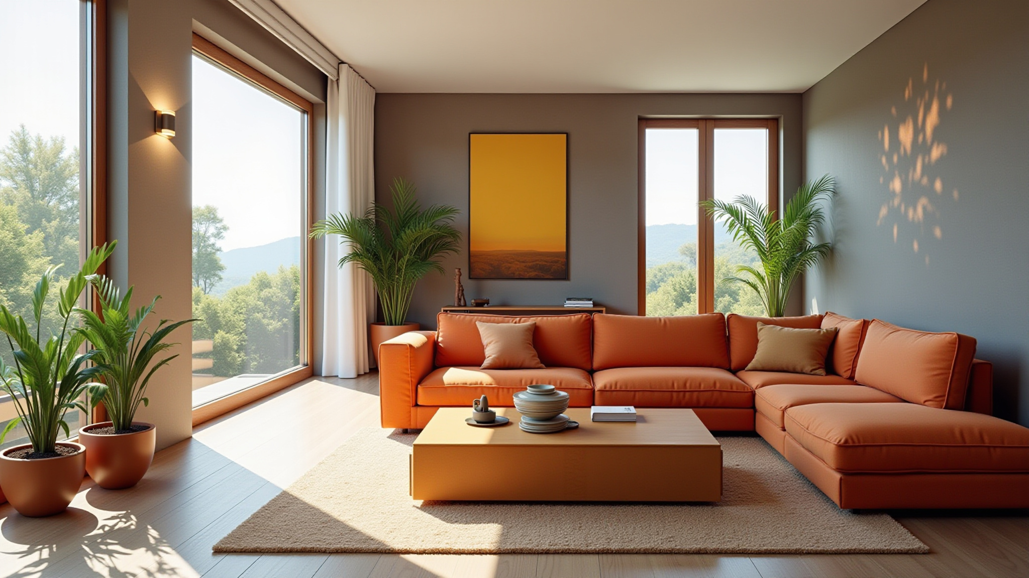 Sala de estar iluminada com sofá retrátil moderno, design brasileiro e cores vibrantes.