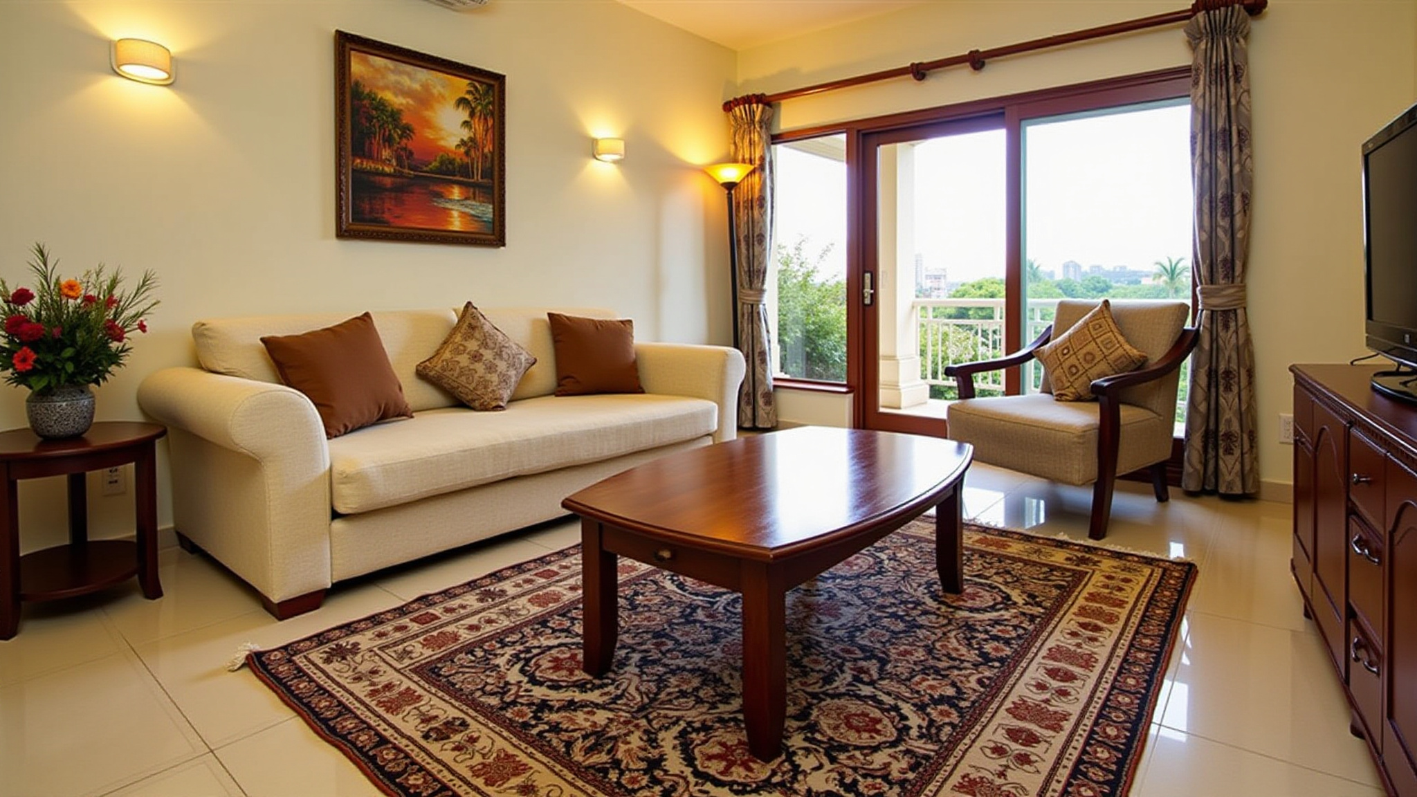 Sala iluminada com tapete grande delimitando área de estar e sofá com almofadas coloridas.