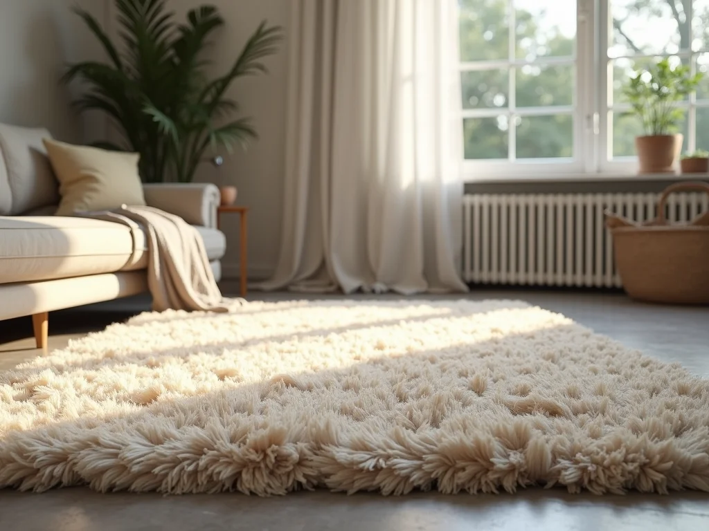 Sala de estar com iluminação natural destacando a maciez de um tapete shaggy bege, com pelos longos e volumosos, proporcionando conforto visual.