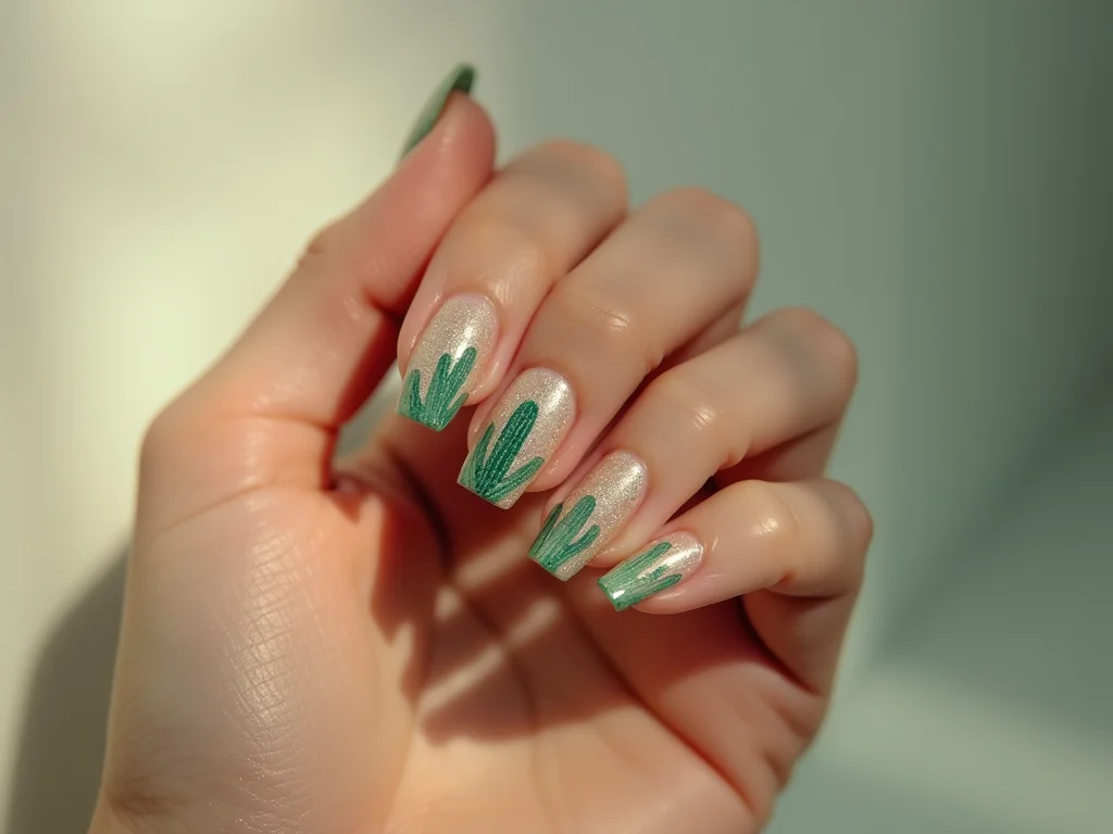 Unhas decoradas cactos com aplicação de glitter verde em algumas unhas e um cacto em relevo 3D com acabamento holográfico em outra, sobre base transparente.