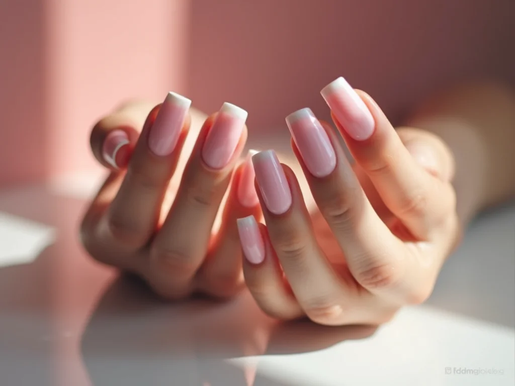 Mão exibindo unhas de gel com francesinha clássica, com a ponta branca bem definida e base rosada translúcida, em ambiente com iluminação de estúdio.