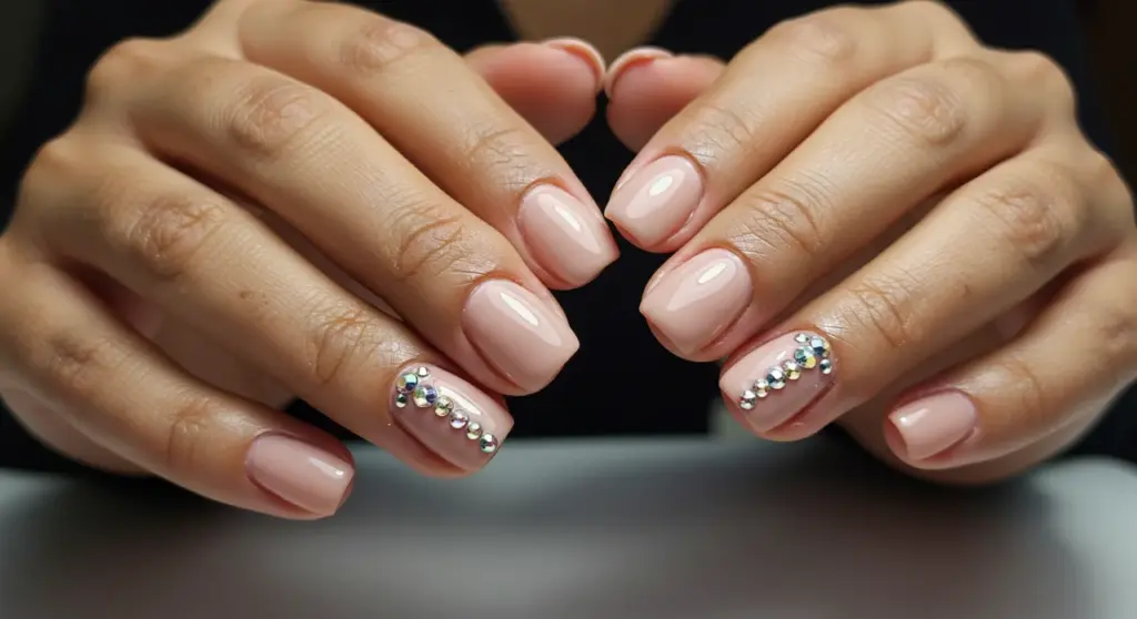 Filha única com strass brilhantes, unha em destaque, esmalte neutro, mãos brasileiras.