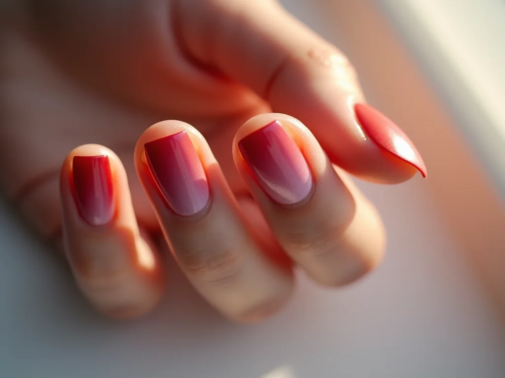 Visão superior de unhas com efeito ombré de vermelho cereja para rosa choque, com acabamento polido.