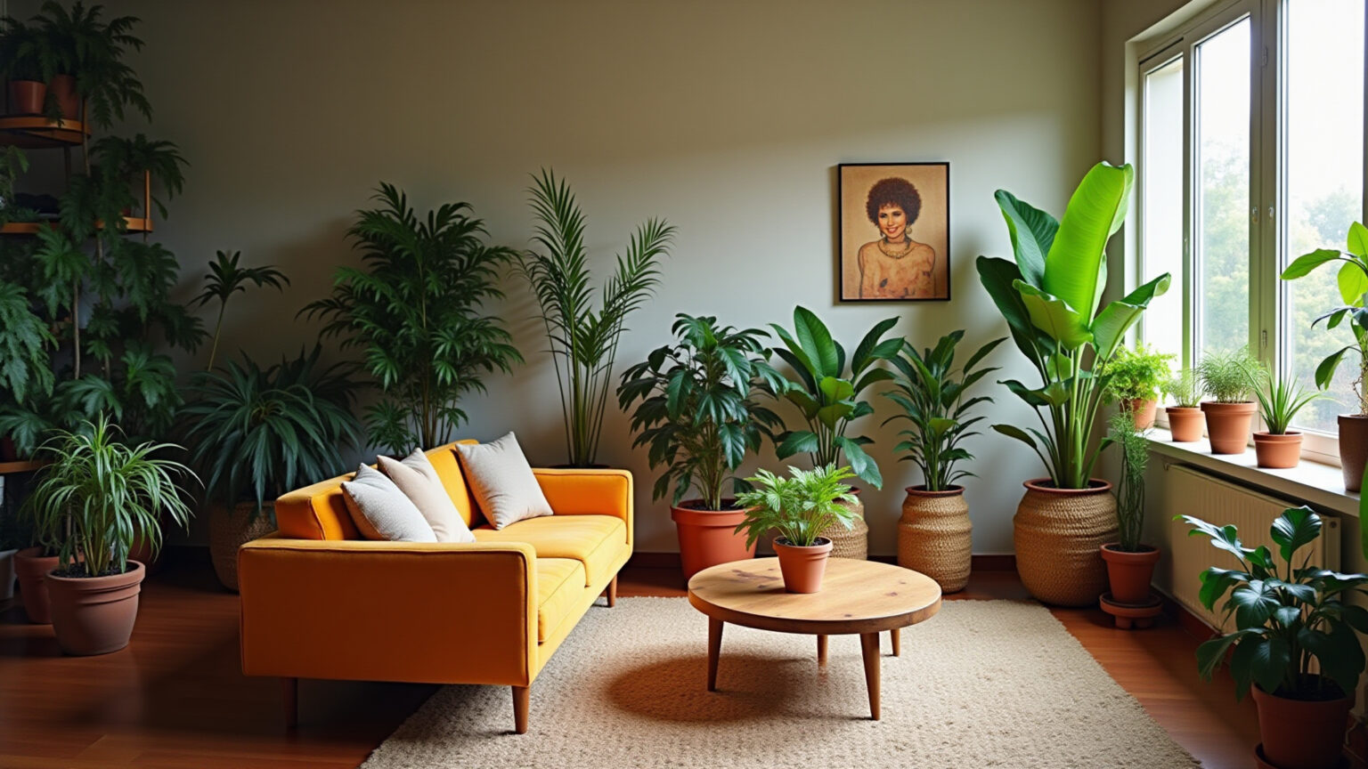 Cachepots de madeira elegantes com plantas em sala aconchegante.